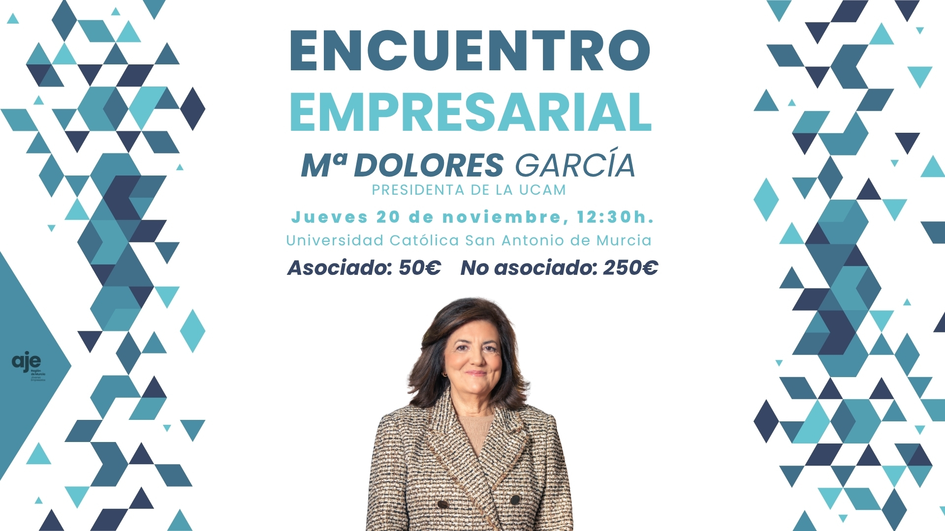El próximo jueves 20 de noviembre, AJE Región de Murcia organiza un exclusivo Encuentro Empresarial con Dña. María Dolores García, presidenta de la UCAM. La Universidad Católica San Antonio de Murcia fue Mención de Honor a la Trayectoria Empresarial en la entrega del Premio CaixaBank Jóvenes Empresarios "Héroes" 2025.