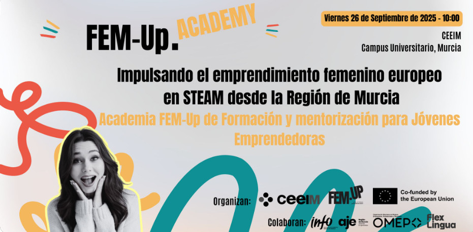 El próximo 26 de septiembre de 2025, el Centro Europeo de Empresas e Innovación de Murcia (CEEIM) organiza el evento FEM-UP: Impulsando el emprendimiento femenino europeo en STEAM desde Murcia, una jornada que servirá para lanzar oficialmente la Academia Europea de Formación FEM-UP. Será un espacio de inspiración, aprendizaje y conexión para jóvenes emprendedoras de la Región.