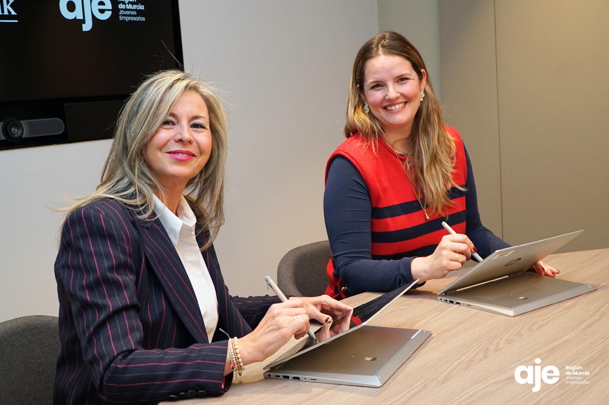 En el acto de firma de renovación del convenio ha participado la directora territorial de CaixaBank en la Comunidad Valenciana y la Región de Murcia, Olga García; y la presidenta de la Asociación de Jóvenes Empresarios de la Región de Murcia, Almudena Abellán.