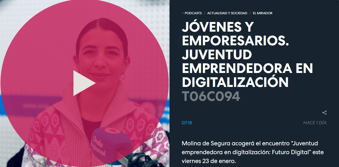 Cristina Mirete, responsable de la Oficina Acelera Pyme de AJE Región de Murcia, participó recientemente en el programa El Mirador de Onda Regional de Murcia, donde presentó el encuentro “Juventud emprendedora en digitalización: Futuro Digital”, que tendrá lugar el viernes 23 de enero en Molina de Segura.