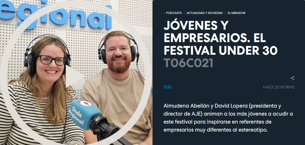 Ayer, en el espacio El Mirador de Onda Regional, Almudena Abellán, presidenta de AJE Región de Murcia, junto con David Lopera, director gerente de la asociación, participaron en una entrevista sobre el UNDER 30 FEST, animando a la juventud murciana a sumarse al evento y presentando los principales atractivos del programa..