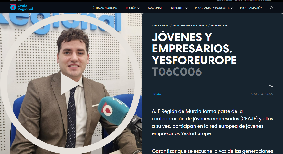 AJE Región de Murcia intervino en el programa El Mirador, emitido por Onda Regional de Murcia. Con la participación del Vicepresidente de la Asocaición, Eric Van Hout, aprovechamos este espacio para explicar nuestra vinculación con Confederación Española de Jóvenes Empresarios (CEAJE) y las oportunidades que da la red europea Yes for Europe a los jóvenes empresarios.