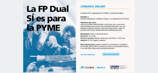 CROEM, junto a CaixaBank Dualiza, organiza el próximo martes 14 de junio a las 10:00h una jornada online de 1h30, "La FP Dual SÍ es para PYME", impartida por María Ángeles Caballero, directora del Instituto Dual de Europa.