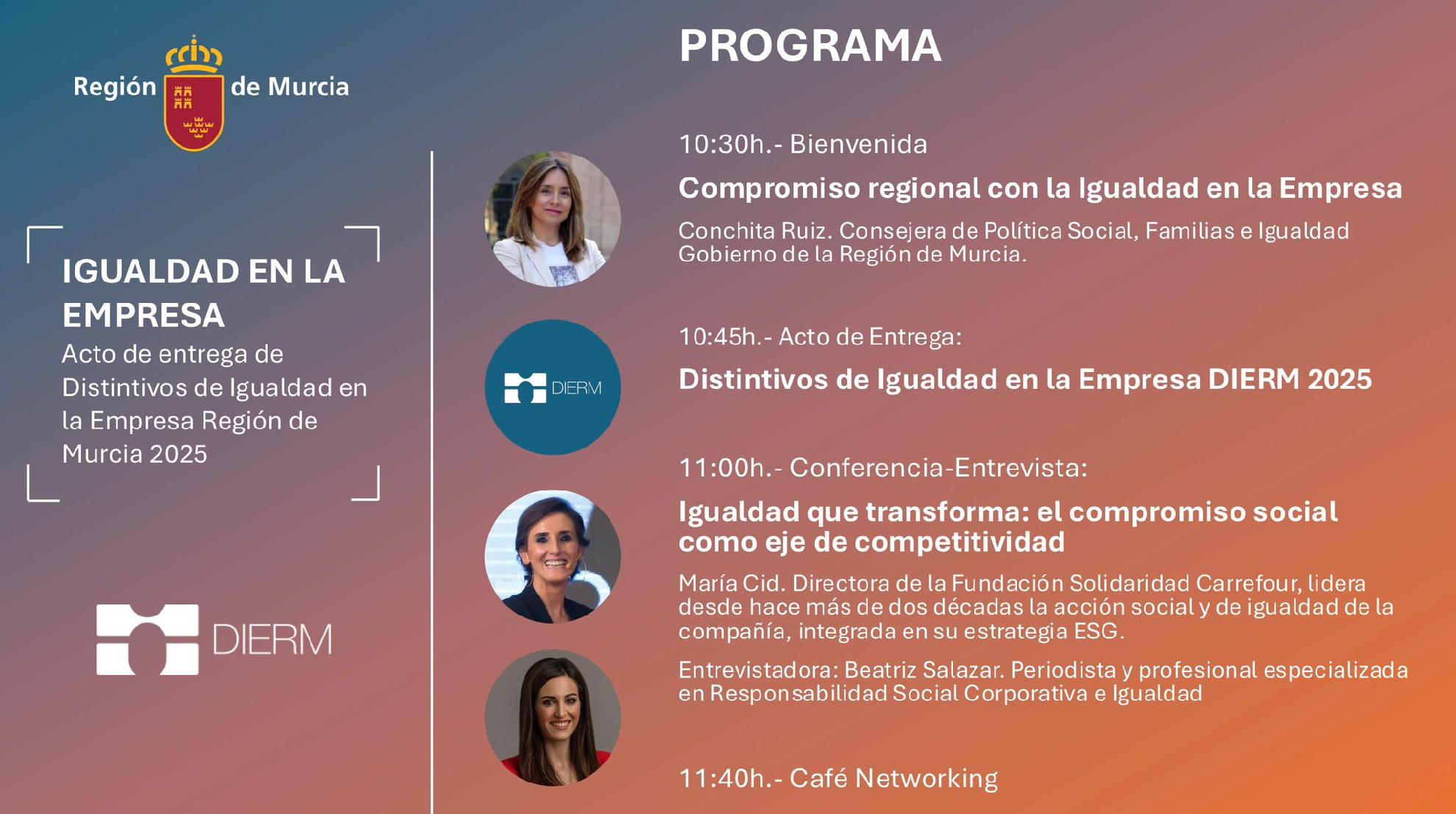 La Dirección General de Mujer y Prevención de la Violencia de Género te invita al encuentro para reconocer a empresas comprometidas con la igualdad en la Región de Murcia y reflexionar con expertos sobre cómo el compromiso con la igualdad de oportunidades impulsa la competitividad empresarial.