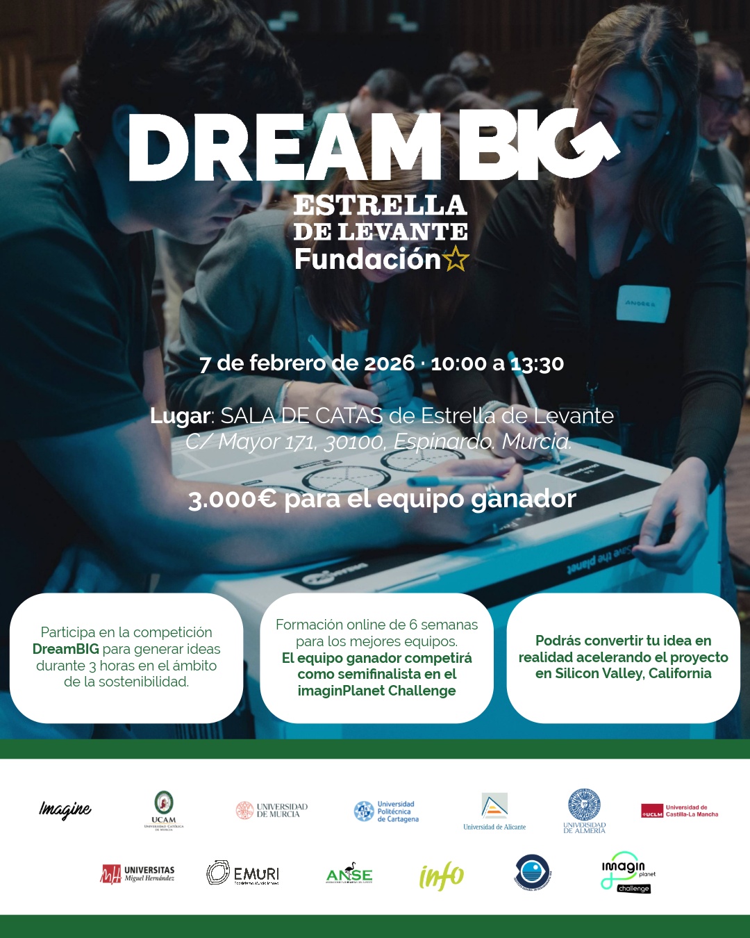 La primera fase, bajo el nombre de “Dream Big”, se celebrará el próximo sábado 7 de febrero en la Sala de Catas de Estrella de Levante. Durante esta jornada intensiva de tres horas, los equipos participantes deberán idear soluciones innovadoras a distintos retos medioambientales que se les plantearán, trabajando de forma colaborativa y creativa en un entorno de alta energía e inspiración.