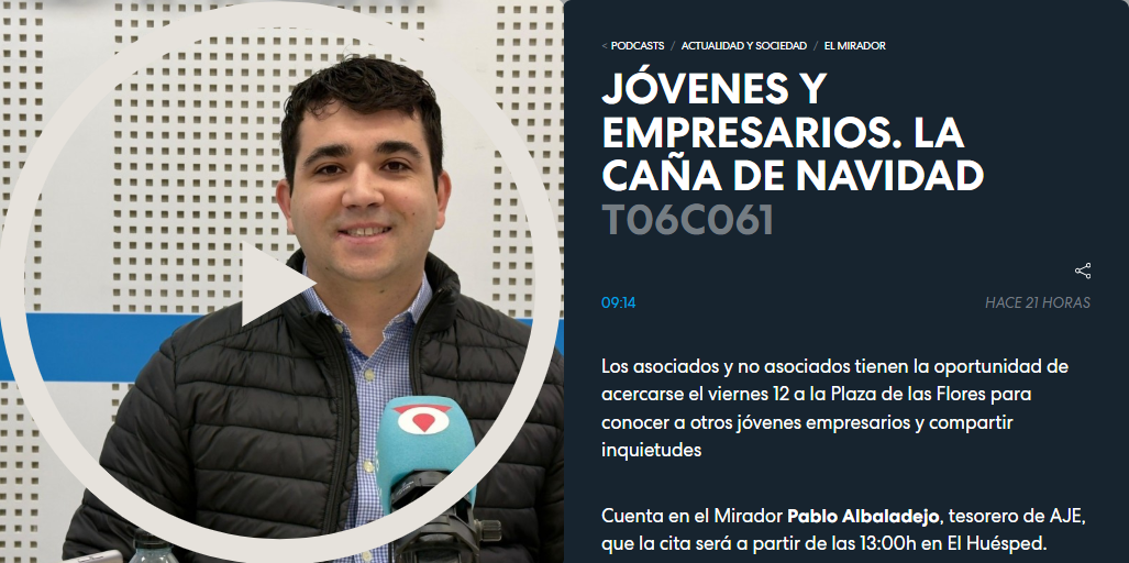 El tesorero de AJE Región de Murcia, Pablo Albaladejo, participó en el programa “El Mirador” de Onda Regional, donde presentó la próxima edición de “La Caña en Navidad” organizada por la asociación.