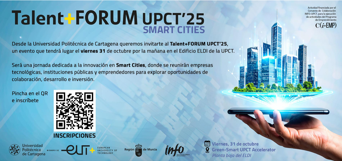 Desde la Universidad Politécnica de Cartagena queremos invitar al ecosistema innovador y emprendedor a venir al Talent+FORUM UPCT’25, que se celebrará el viernes 31 de octubre por la mañana en la planta baja del Edificio ELDI de la UPCT.