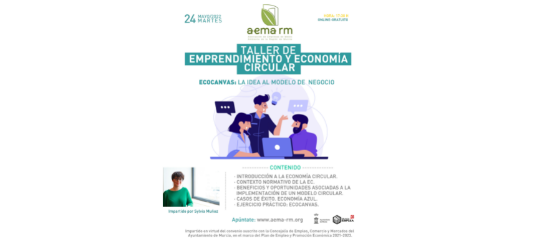 AEMA Región de Murcia organiza el próximo 24 de mayo a las 17:30h el taller Emprendimiento y Economía Circular: De la idea al modelo de Negocio impartido por Sylvia Muñoz (online).