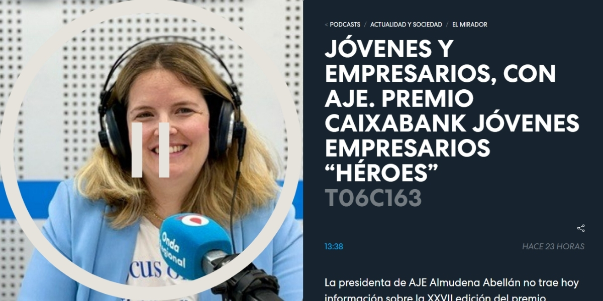La presidenta de AJE Región de Murcia, Almudena Abellán, ha participado en Onda Regional de Murcia para animar a los jóvenes empresarios de la Región a presentar su candidatura al XXVII Premio CaixaBank Jóvenes Empresarios “Héroes”, cuya gala se celebrará el próximo 11 de junio.